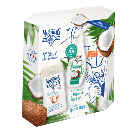 Благодаря ноткам высушенной мякоти кокосового ореха, средства набора дарят ощущение расслабления во время и после душа. Экстрамягкий гель для душа «Прованс Экзотик» нежно очищает кожу, а лосьон с кокосовой водой мгновенно увлажняет, действуя в течение 48 часов. Средство содержит 95% натуральных ингредиентов и органическую кокосовую воду.